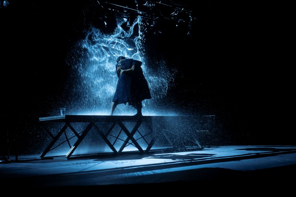 Nela, as atrizes Bete Coelho e Georgette Fadel aparecem abraçadas, de pé sobre uma grande mesa, no exato momento em que são atingidas por um grande bloco de água que despenca do teto. O líquido brilha por conta da iluminação, contrastando com o breu do restante do cenário. “Eu estava fotografando, e a luz de cena mudou de repente”, conta Anne. “Uma das perguntas que mais me fazem é se a gente assiste às peças antes pra saber o que vai estar fotografando. Nem sempre, ou quase nunca. Essa foto mesmo aconteceu quase no susto. Depois eu nem editei.”